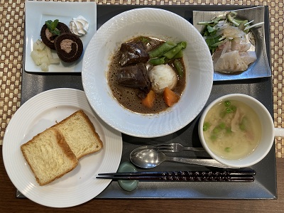 黒毛和牛の赤ワイン煮込み 真鯛のカルパッチョ 大麦と野菜のスープ チョコレートケーキ