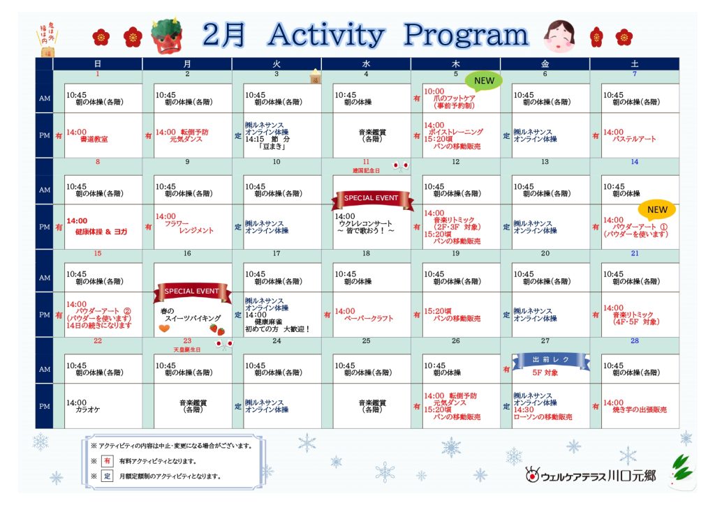 2026年2月のアクティビティカレンダーはこちらです。 ➡ 2月アクティビティカレンダー