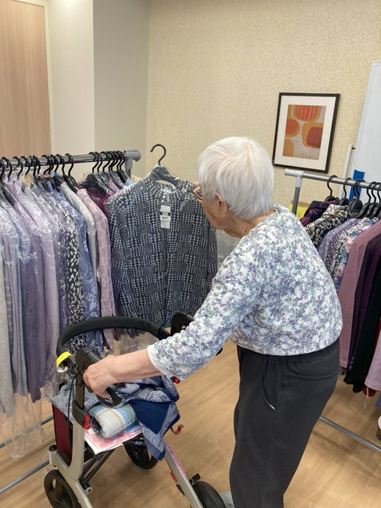 秋冬物のカーディガンや長袖の服を中心に、色やデザインを見比べながら、ご入居者同士でも会話が弾み、笑顔あふれるひとときとなりました。
