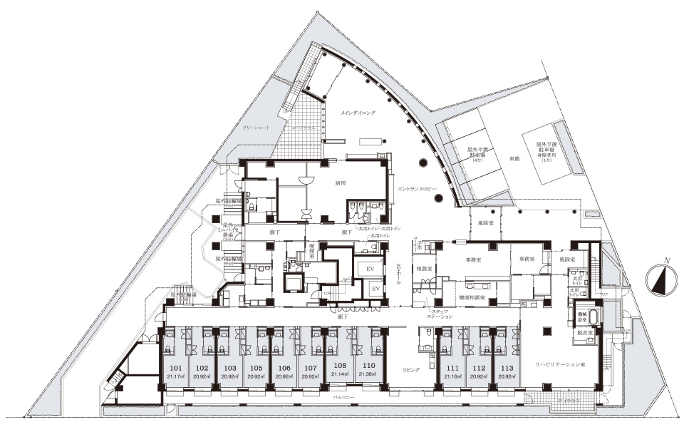 | 共用設備 | メインダイニング(1階)、フロアダイニング(2~5階)、多目的室、リビングルーム、浴室、個人浴室、健康管理室、相談室、ランドリー、ルーフテラス、屋上庭園、駐車場 |