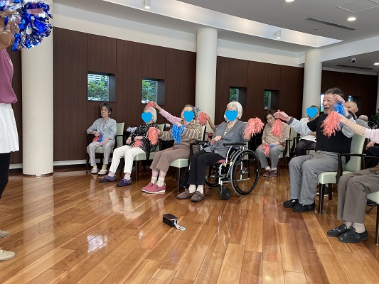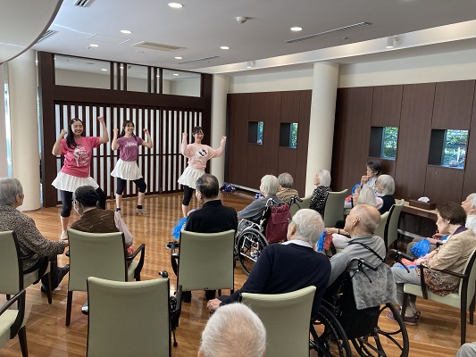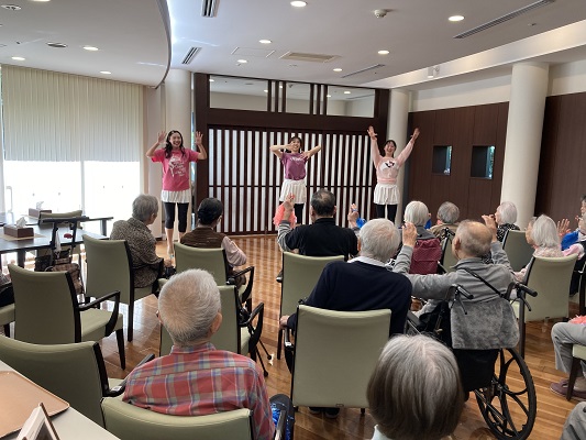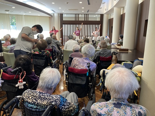 いつもケアしてくれているスタッフがダンスを披露するということで、大勢のご入居者が集ってくださいました。