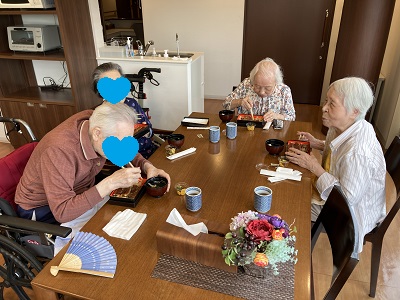 いつも同じテーブルを囲んで食事を召し上がっている4名のご入居者。