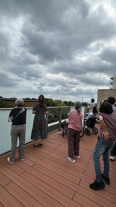 あいにくの曇り空でしたが、ご入居者はドキドキしながら空を見上げます。