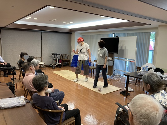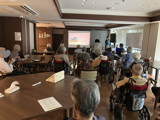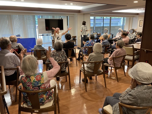 去年、タップダンスショーがありました。その時にダンスの先生がご入居者の生き生きしている表情に感動して「逆に皆様からパワーをもらいました!他にもっと出来ることはないですか」と相談を受け、この椅子タップ教室が始まることになりました。