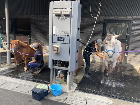洗っているスタッフは東京農業大学の学生さんだそうです。馬も気持ち良さそう!!