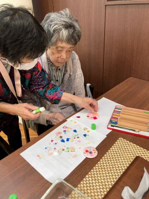 色鉛筆で絵や文字を書いたり、花や雪の結晶の形に型抜きした折り紙を貼り付けるなど、思い思いのデザインを作っていきました。