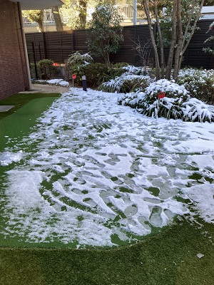 翌日の写真ですが、ルーフテラスや中庭のパットゴルフグリーンにも薄っすらと雪が残っておりました。