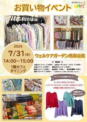 7月31日に、お洋服の移動販売「アミュージン」がウェルケアガーデン馬事公苑にやってきました♪ 季節ごとに1階ダイニングに...