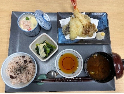 🟣🟣特別食材敬老の日🟣🟣 大海老と秋野菜の天麩羅、蟹入り茶碗蒸し、湯葉と小松菜のお浸し、赤飯、赤だし ~大ぶりの秋野菜の...