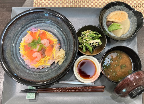 19日の昼食、五目ちらし寿司、姫こうやの炊合せ、小松菜のピーナッツ和え、赤だしは暑い日でもさっぱりと食べることができ、見...