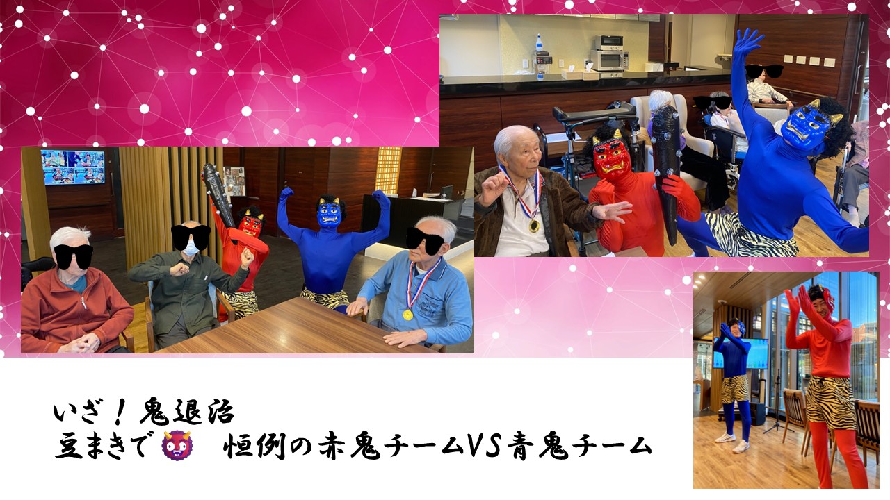 節分豆まき 皆さま 本気です! ウエルケアガーデン深沢の豆まきは赤鬼チームVS青鬼チームにわかれます👹にぶつけるだけでな...