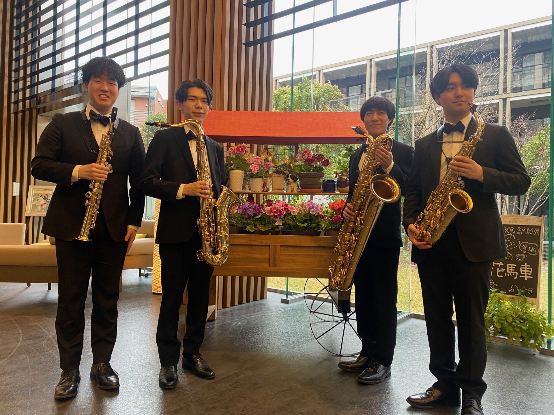 イケメン4人組来る! ウエルケアガーデン深沢の吹き抜けのロビーにサックスが心地よく響く午後となりました現役音大生タキシー...