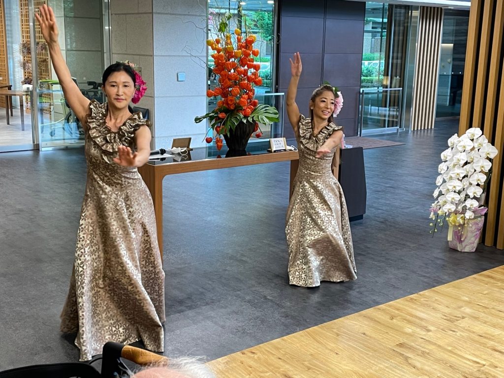 暑い日が続いております少しでも爽やかにハワイ気分を味わっていただこうとフラダンサーをお招きしました自然と皆さまの腕がつられて音楽に合わせてお花の形や波の踊りに・・やっぱりいいわね~ハワイまた行きたいわと、みなさま・・・ゆったりとした音楽と踊りに癒された午後でした