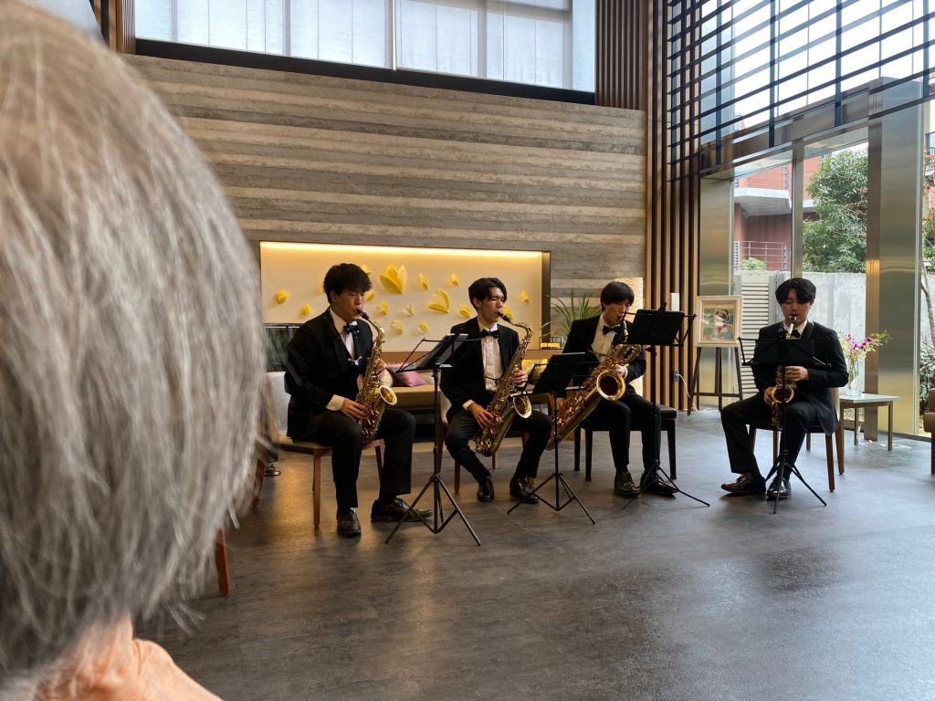 ウエルケアガーデン深沢の吹き抜けのロビーにサックスが心地よく響く午後となりました現役音大生タキシードをお召しになり何と素敵な好青年ご入居者の皆さまが今後の活躍を見守ろう!そんなエールをくださいましたがんばれよ!このお声に感涙お優しい皆さまが住まうウエルケアガーデン深沢です