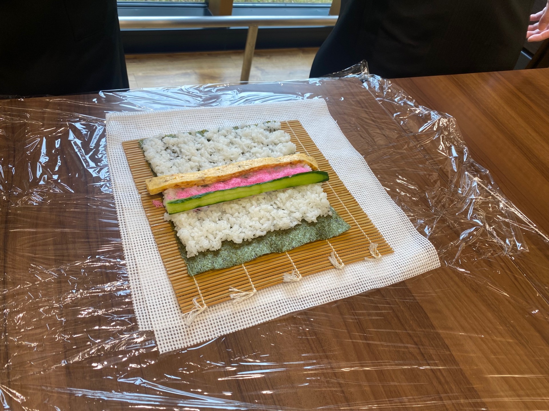 お料理初体験の殿方も! 初の試みです寿司職人と一緒に太巻きづくりコツは、すし飯で両端に土手を作るのだとか男子厨房に入るべ...