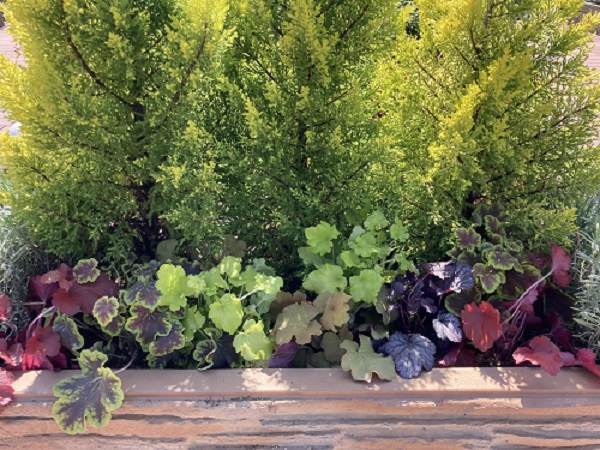左のプランターにはユキノシタの一種の「ヒューケラ」という可愛らしいカラフルな植物、