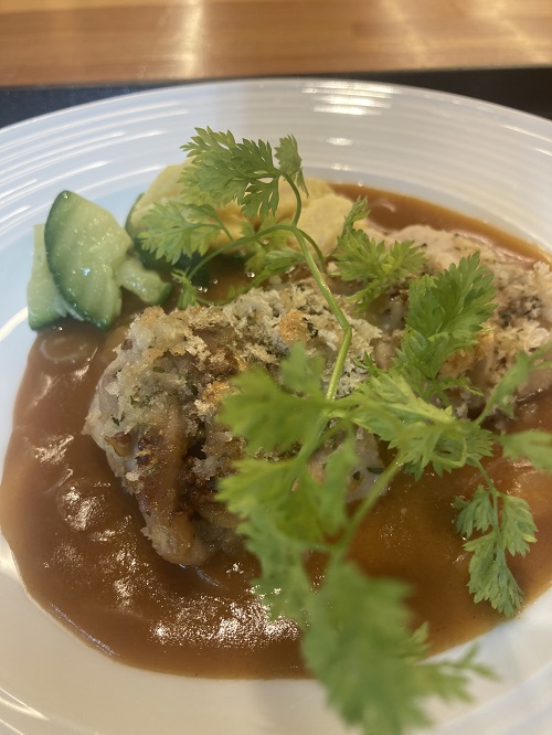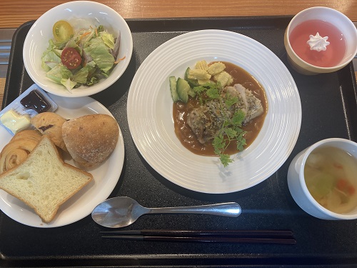 鶏肉のディアブル風 サラダ 野菜スープ 数種のパンは食べ放題で召し上がっていただきました。