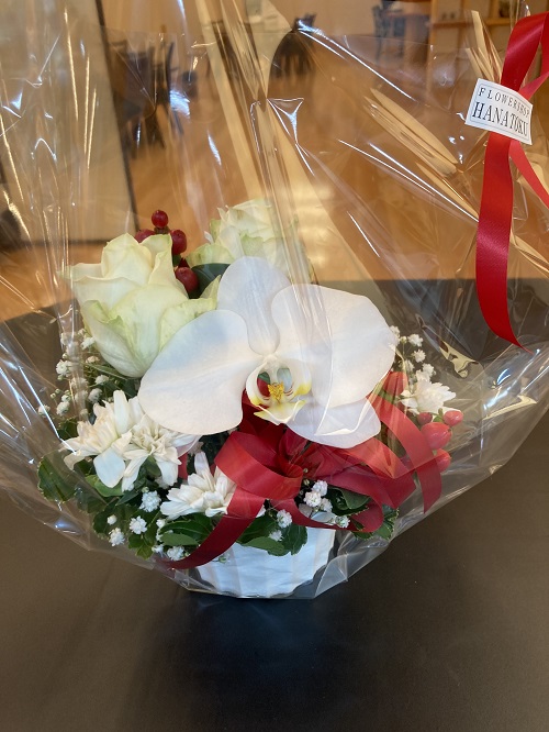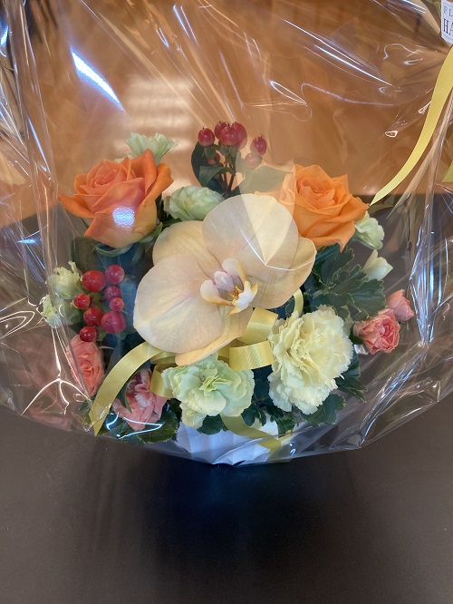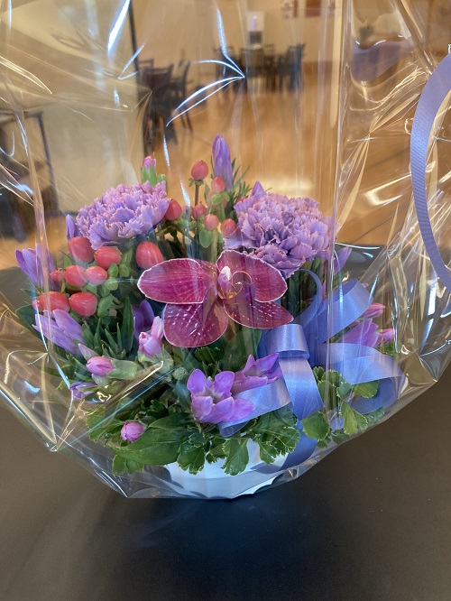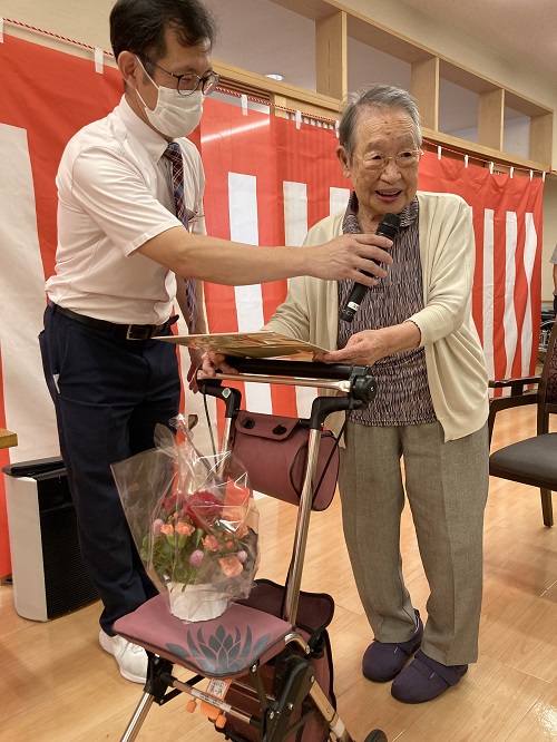 プログラム2 本年から白寿以上の方々にお花とスタッフからの寄せ書きの色紙を贈呈させていただきました。久が原には現在百寿(100歳)の方が2名、白寿(99歳)の方が2名、卒寿(90歳)の方が2名、米寿(88歳)の方が8名いらっしゃいます。最高齢の105歳の方は皆様の前にお立ちになり、一言いただきました。いつも若々しい女性の方です。