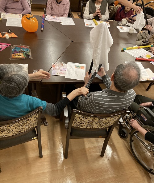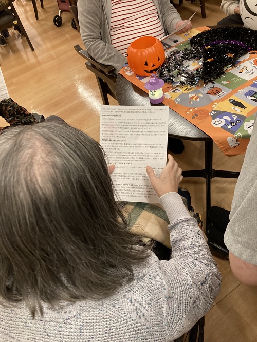 ハロウィーンパーティーを開催しました。ハロウィンの歴史や、どういう行事なのかを説明させていただき、お飲み物を召し上がりながら対抗ゲームやパタカラ早口言葉などをお楽しみいただきました。