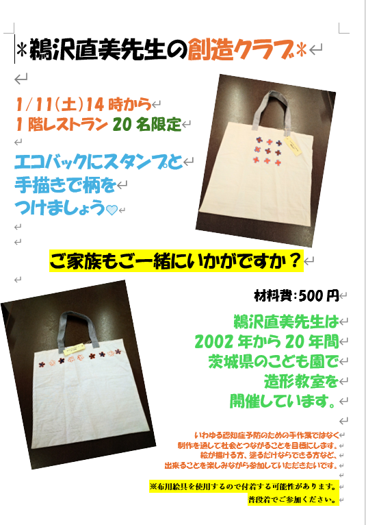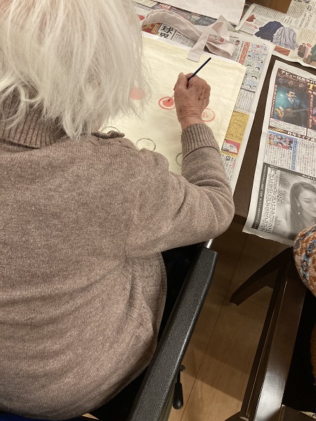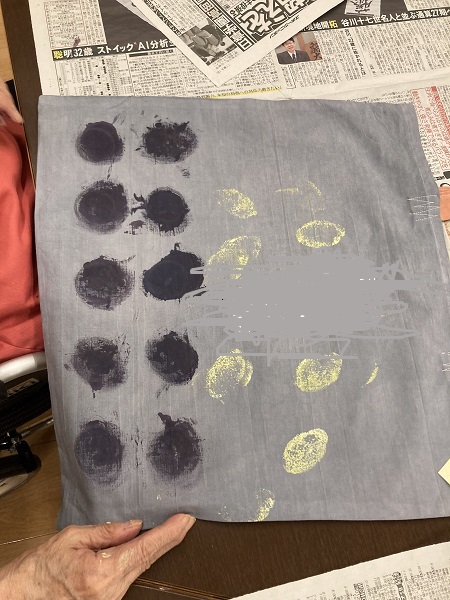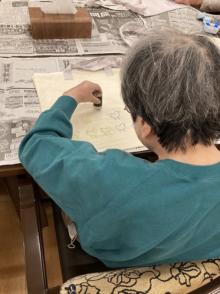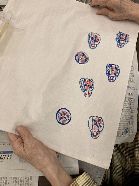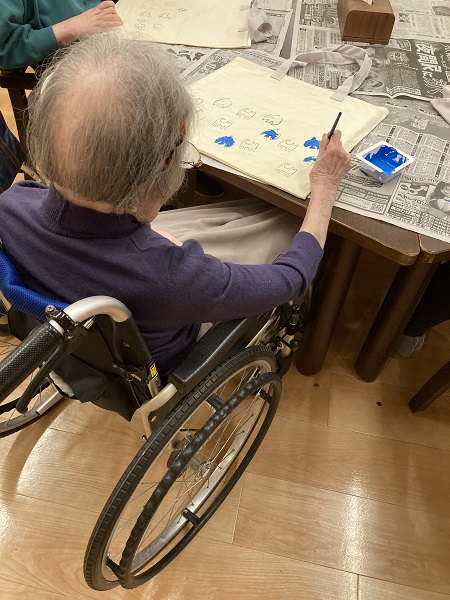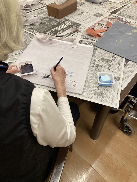 先生が作成したエコバックに、ご入居者が衣料用絵具でスタンプを押したり、着色したり、