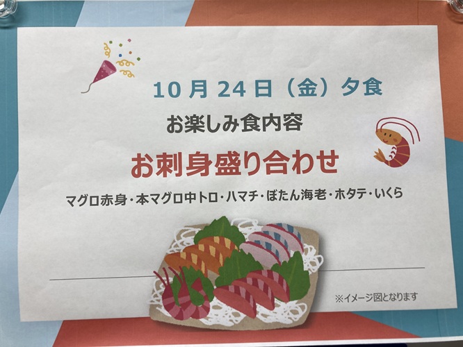 10月のお楽しみ食はお刺身盛り合わせを召し上がっていただきました。