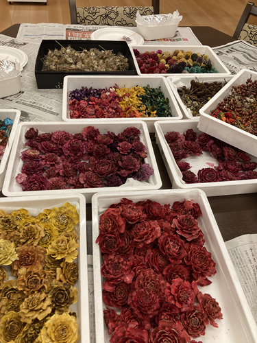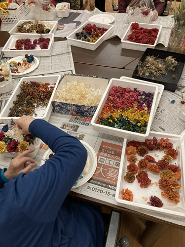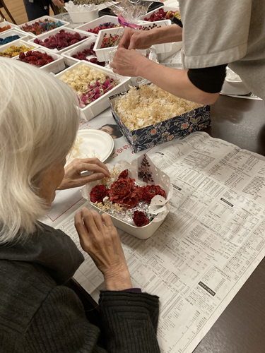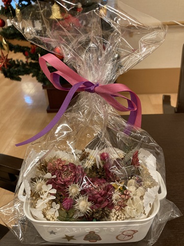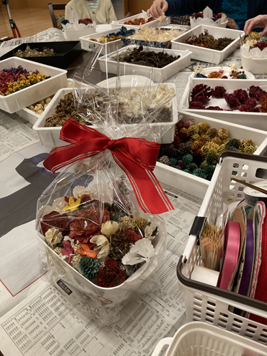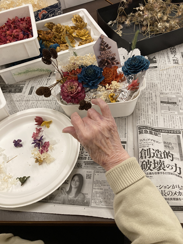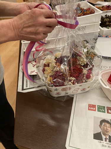 介護スタッフの手作りの素材を使用して、クリスマスのフラワーバスケット作成をしました。