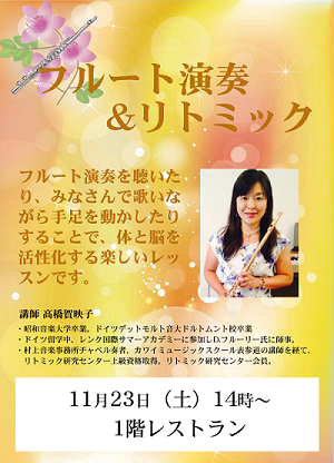 フルートの先生でもあり、リトミックの資格をお持ちの講師の方をお迎えしました。 「紅葉」、「ふるさと」などのフルート演奏や...