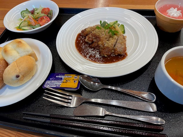 ~MENU~鶏肉のディアブルソース焼き数種のパン盛り合わせグリーンサラダコンソメスープストロベリーゼリー鶏肉は柔らかくお...