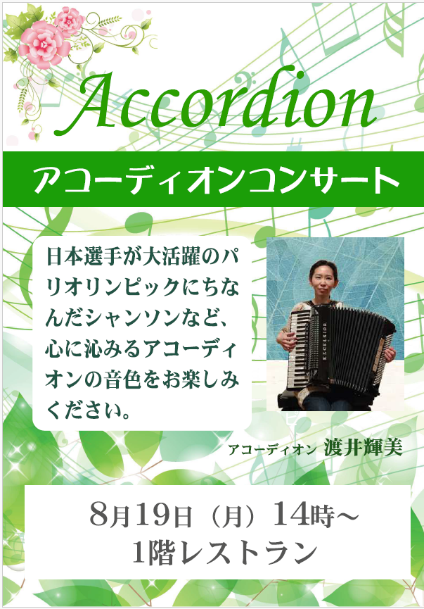 パリオリンピックにちなんだ選曲の、アコーディオンのどこか懐かしい音色に 皆様聞き入っていらっしゃいました。