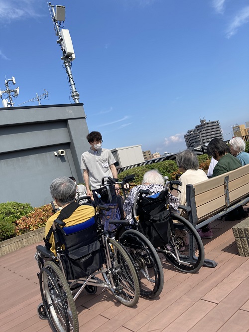 6月の始まりの晴天日に、皆様に外気浴をして頂きました。 1階のバルコニーは大変日当たりがよく、苗を植えたばかりの「フジバ...