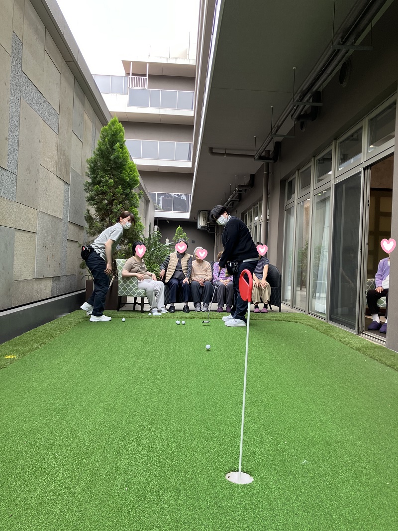ヒルズの中庭には 本格的なパター場があります。 「ゴルフなんてできないわよ~」 と言いながらも なんのなんの! 皆様とて...