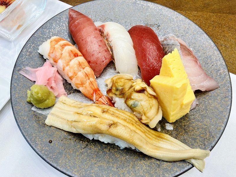 ~特選握り寿司~ 中トロ 赤身 桜鯛 海老 鯵 煮蛤 穴子 玉子焼き 稚鮎と旬菜の天ぷら 浅利の味噌汁 季節の果物