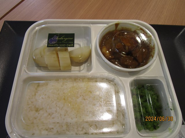 お取り寄せ”くるめし”で大人気の”オーベルジーヌ”のチキンカレー 甘口、 お肉がほろほろとくずれ甘口でも少しスパイスが効いてとても美味しかったそうです。まるまる一つのじゃがいもは厨房で皮をむいて食べやすいように切って頂きました。