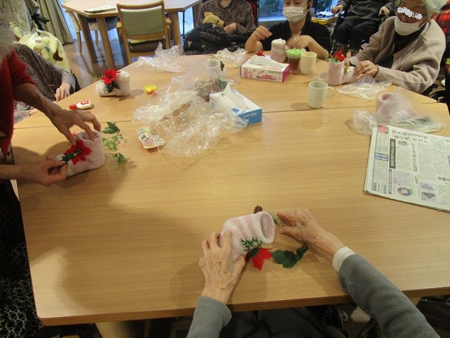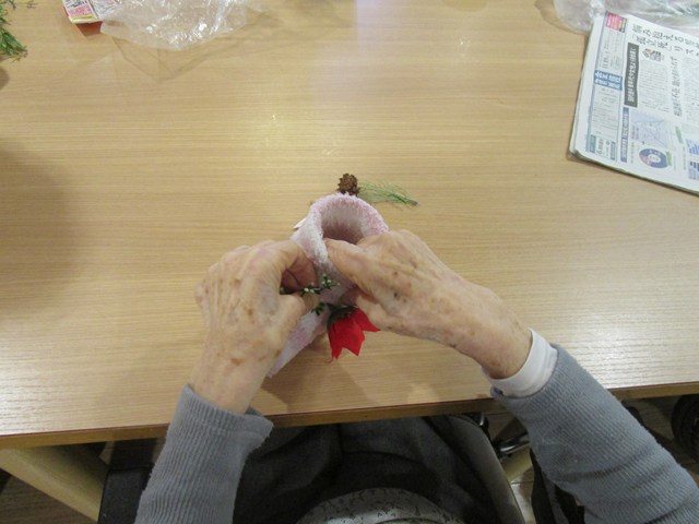 クリスマスの飾りをボンドで付けると出来上がり!!