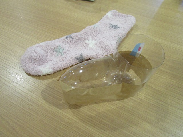 もこもこ靴下に改造したペットボトルを挿入して