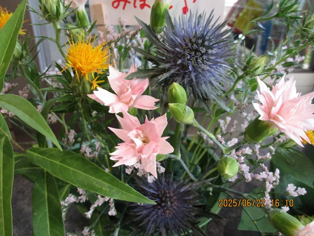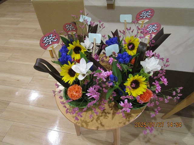お祭り気分で(^^♪ 夏の定番”ひまわり”を中心に、懐かしい”けいとう”と紫色の”りんどう”、ピンク色のカーネーション等...