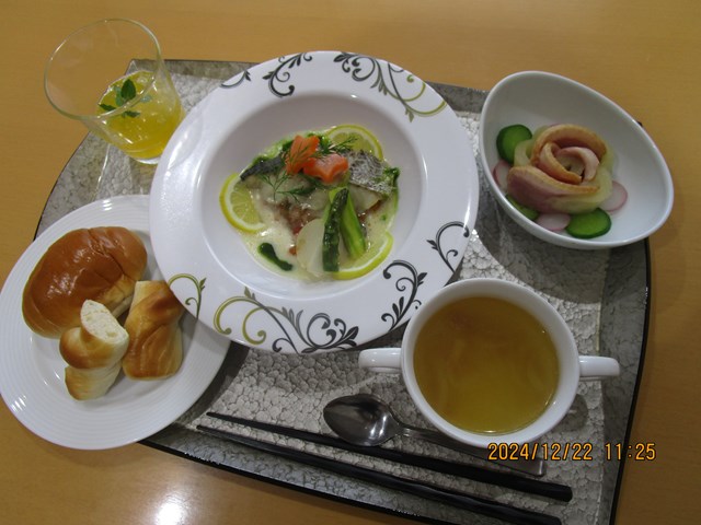 クリスマスメニュー🎄 まずは厨房より特別食です!今回はメインがお魚でしたが、身がふっくらしていてとても食べやすかったです...