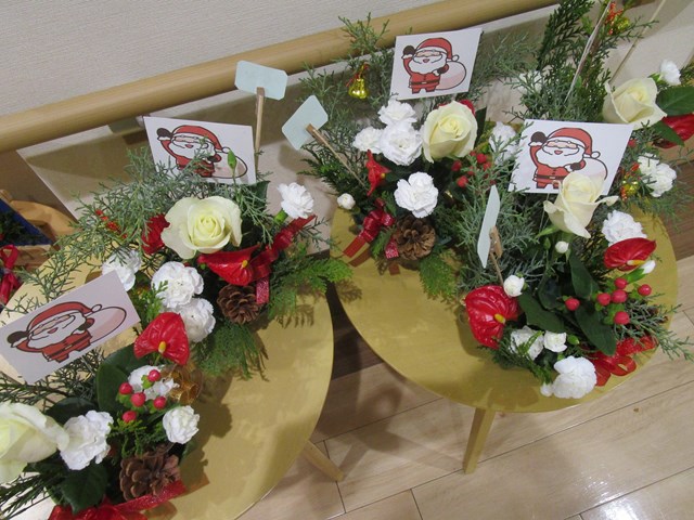 クリスマス会に向けて~ 玄関にはクリスマスカラーのお花で明日の準備が出来ました!