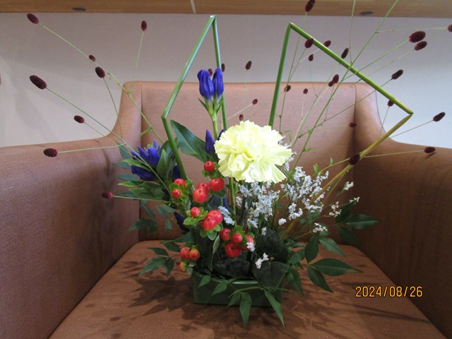「太井を曲げて個性をだして」 初めての花材・・太井(ふとい・井草の仲間)緑色の細長い茎のような太井を自由に曲げてアレンジ...
