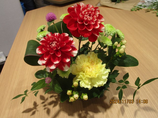 ~秋晴れのお空に映える秋のお花~ ダリア・・赤カーネーション・・黄色スプレー菊・・白せんにちこう・・ピンクヒペリカム・・...