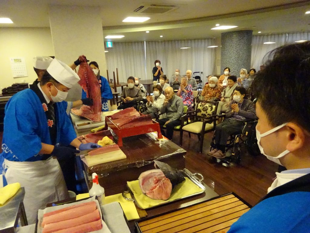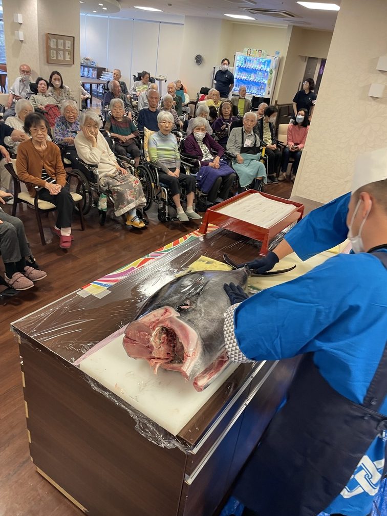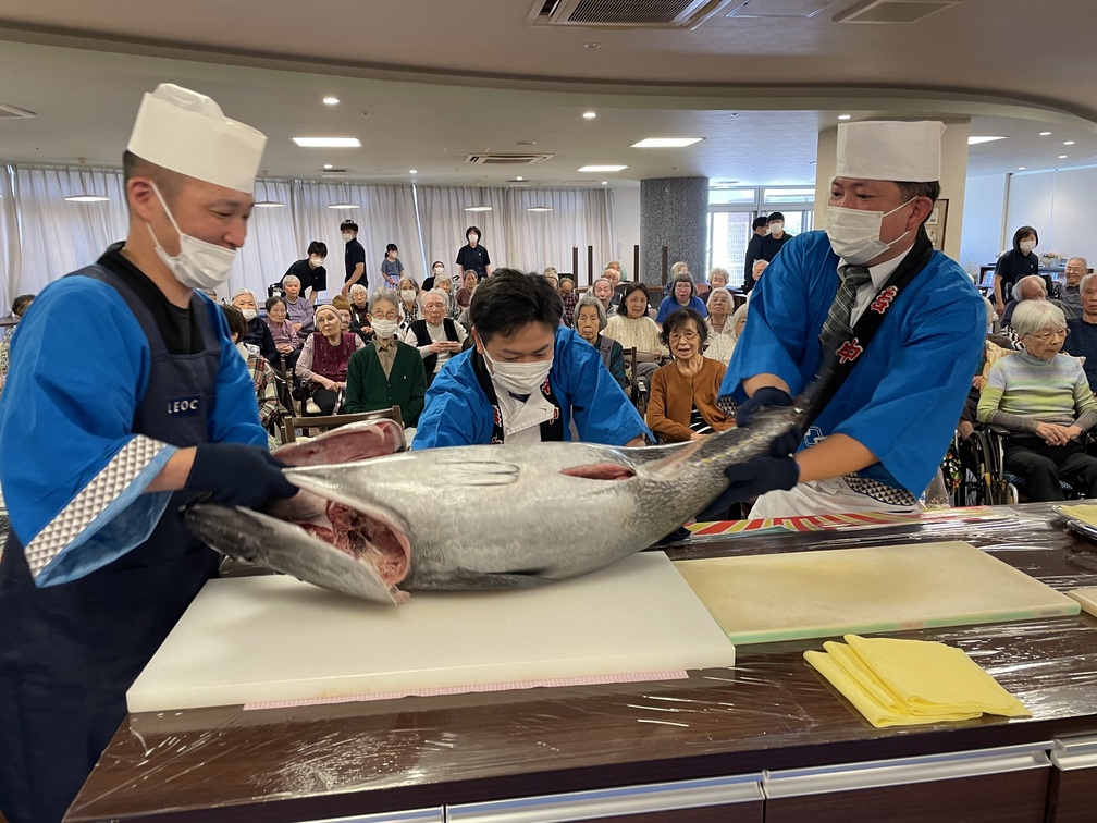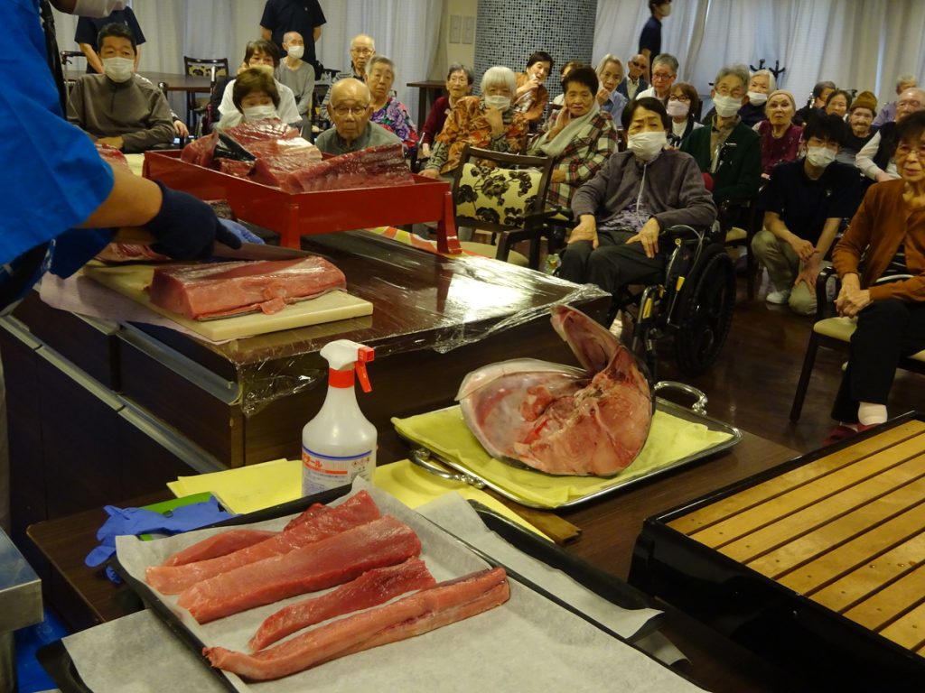 10周年イベントの午前の部は、給食委託会社である㈱LEOC様にご協力頂き、まぐろの解体ショーを開催!