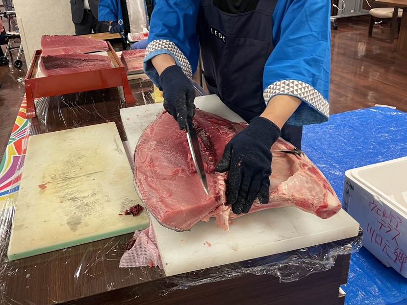 職人さんの鮮やかな手際で、まぐろが解体されていくのを、眼の前でご覧いただきました!