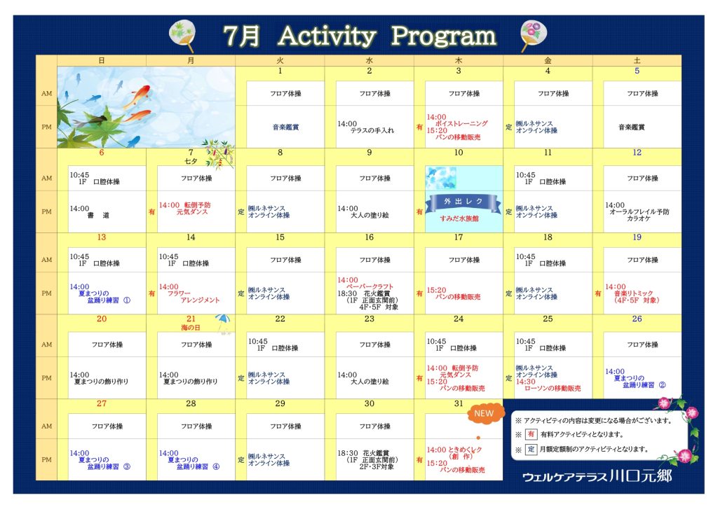 7月のアクティビティカレンダーになります。