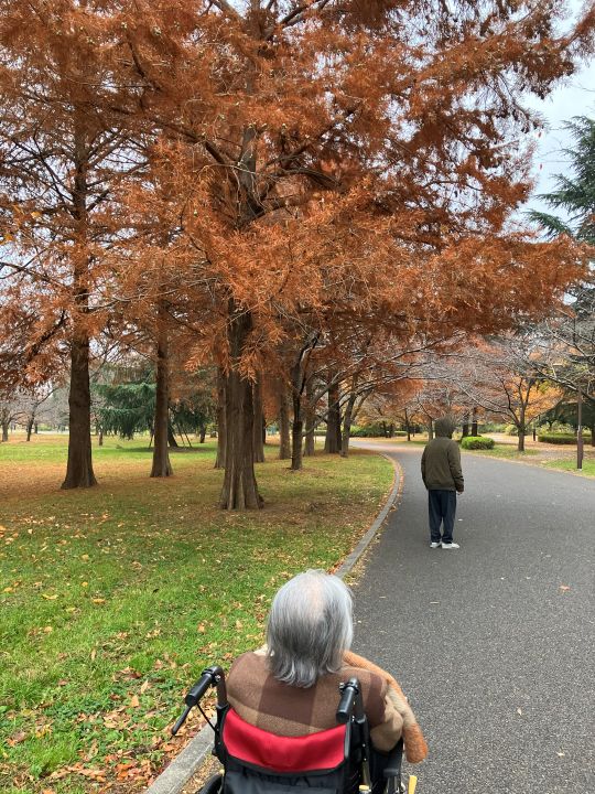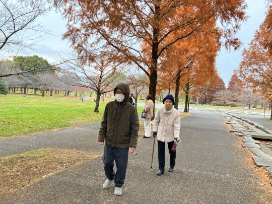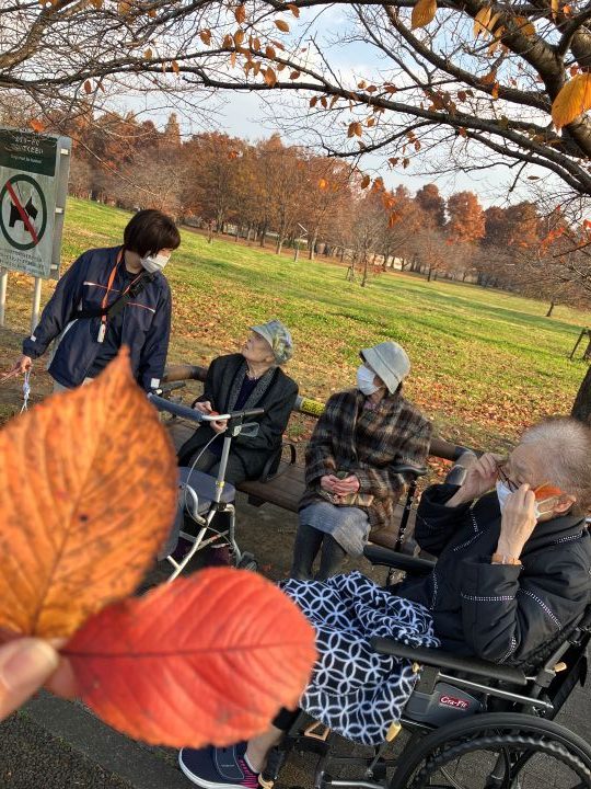 朝から曇り空でしたが、ご入居者と近くの公園へ散策&紅葉を見に行ってきました。