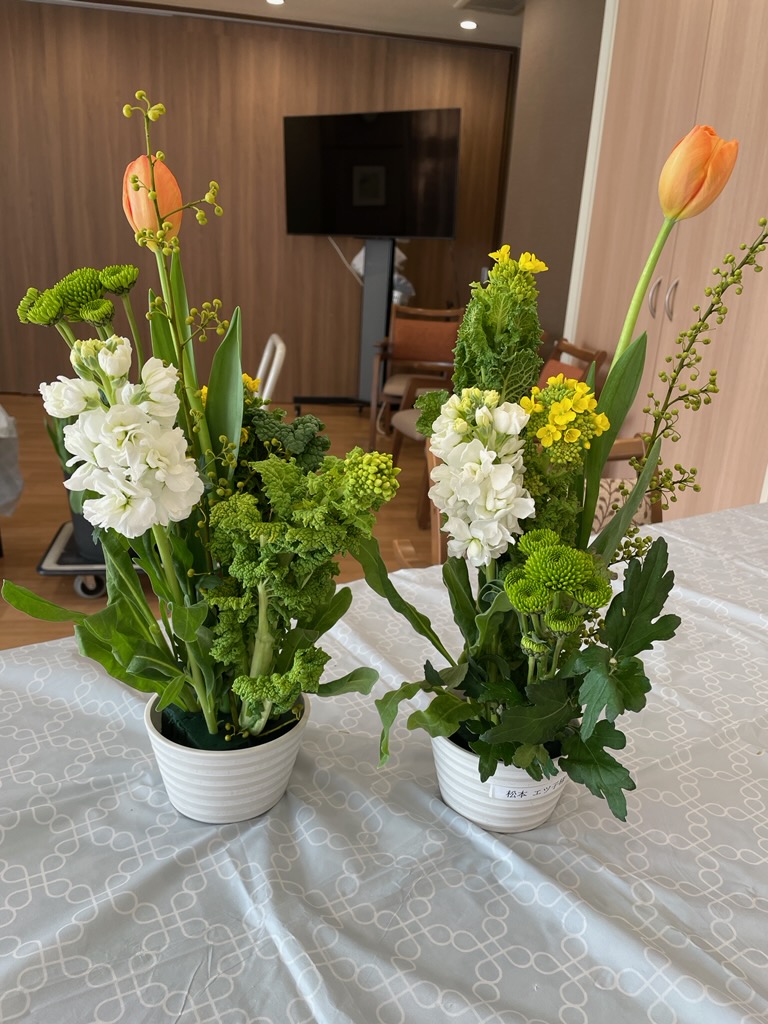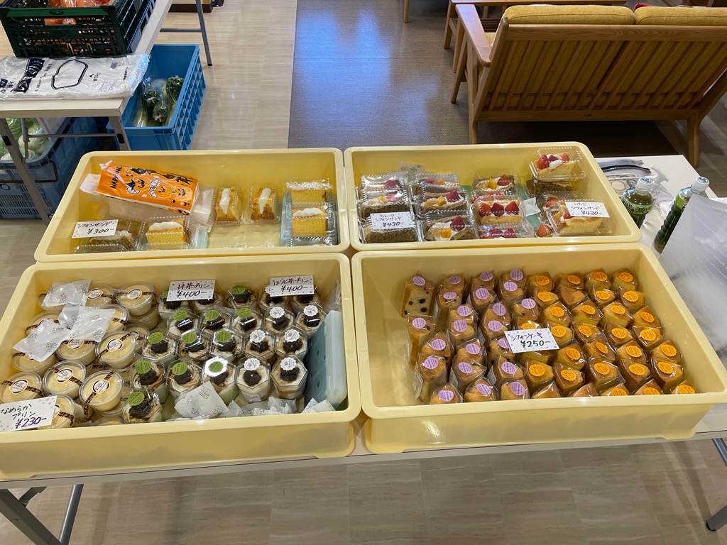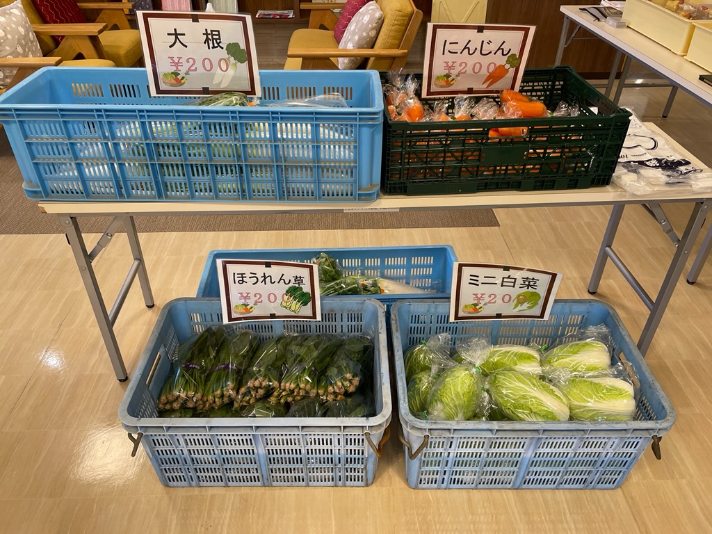 「テラス新座で感じる元気の素」をテーマに、手作り洋菓子の販売(職員ご家族関係の洋菓子屋さんから用意してもらっています)、カフェコーナー、フラワーアレンジメント、訪問マッサージコーナー(現在入っていただいている訪問マッサージ)、野菜の販売(JAあさか野様より仕入れています)を行いました。参加自由でしたので、ご入居者の方も参加されておりました。