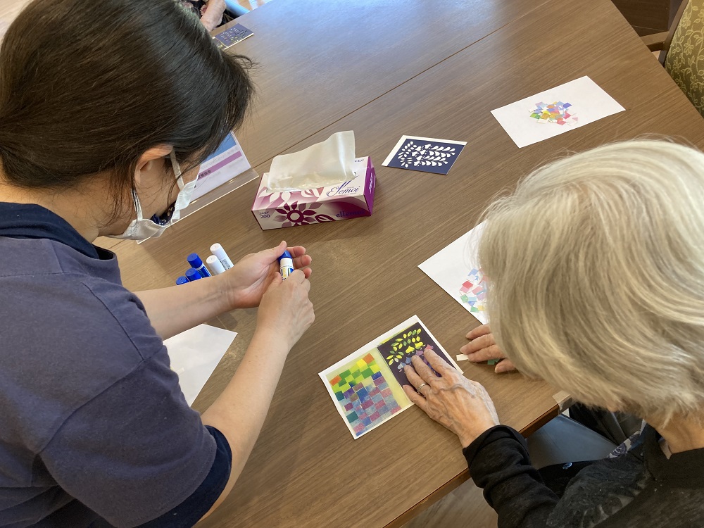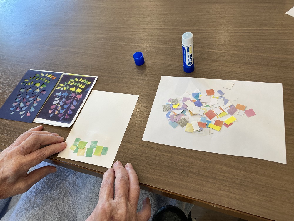 先生の丁寧な説明と説明と実演に、皆さんも真剣な表情で取り組まれ紫やピンク、緑色の折り紙を使ってひとつひとつ丁寧に貼り付け、垂れ下がる藤の花を表現しました。普段は手作業に遠慮がちな方も先生の優しい声掛けに応じて集中し取り組まれていました。