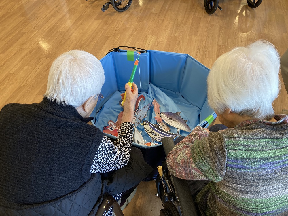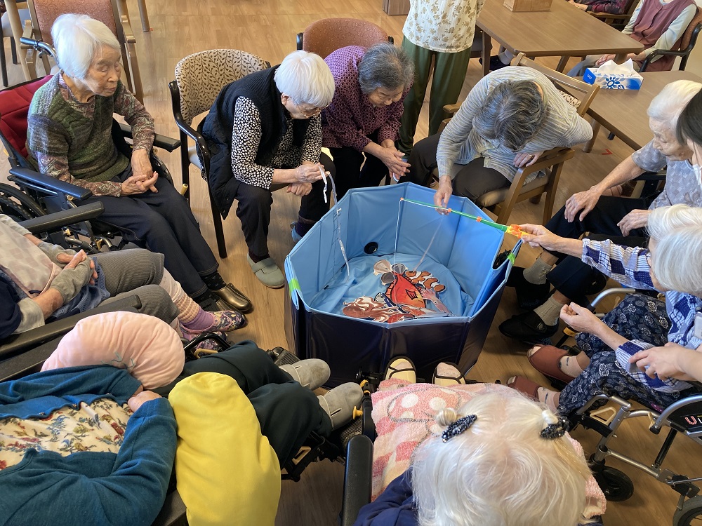 色とりどりの手作りの魚を並べ、竿を使って釣り上げていただきました。