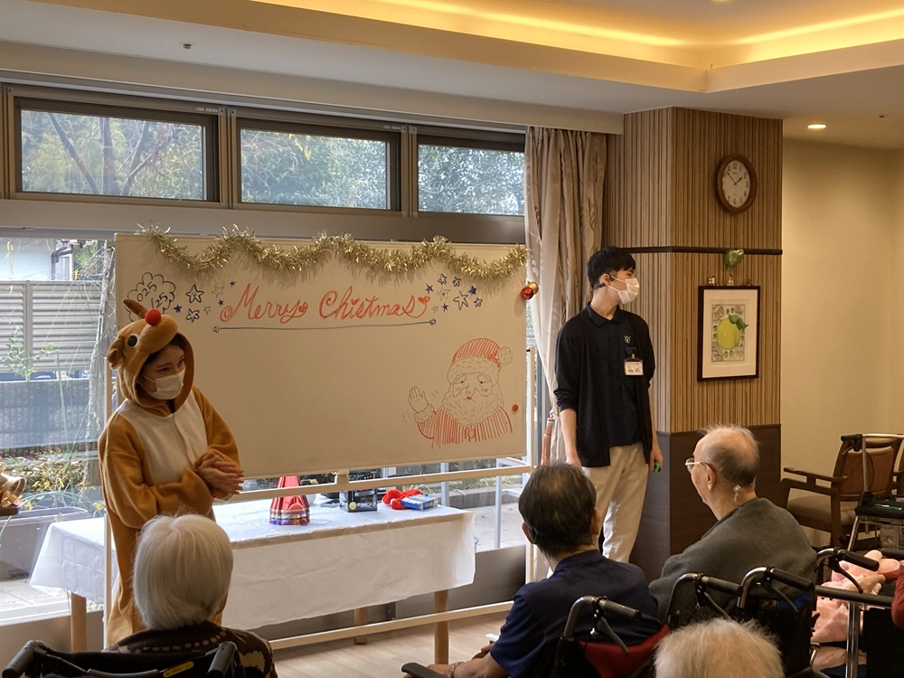 はじめに、「もろびとこぞりて」をご入居者と一緒に歌い、会場は一気にクリスマスの雰囲気に包まれました。歌声に合わせて手拍子をされたり、口ずさまれたりと、和やかな時間となりました。