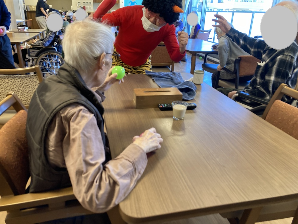 当日は職員が鬼に扮し、ご入居者の皆さまには豆の代わりにカラーボールを投げていただきました。「鬼は外!福は内!」の掛け声とともに、笑顔あふれる楽しい時間となりました。