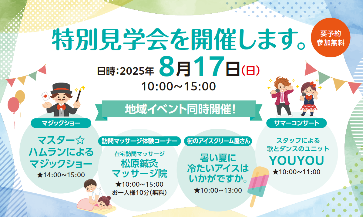 8月17日(日)、当ホームにおいて、特別見学会を実施いたします。楽しいイベントも盛りだくさん!ぜひ一度ご見学にお越しくだ...